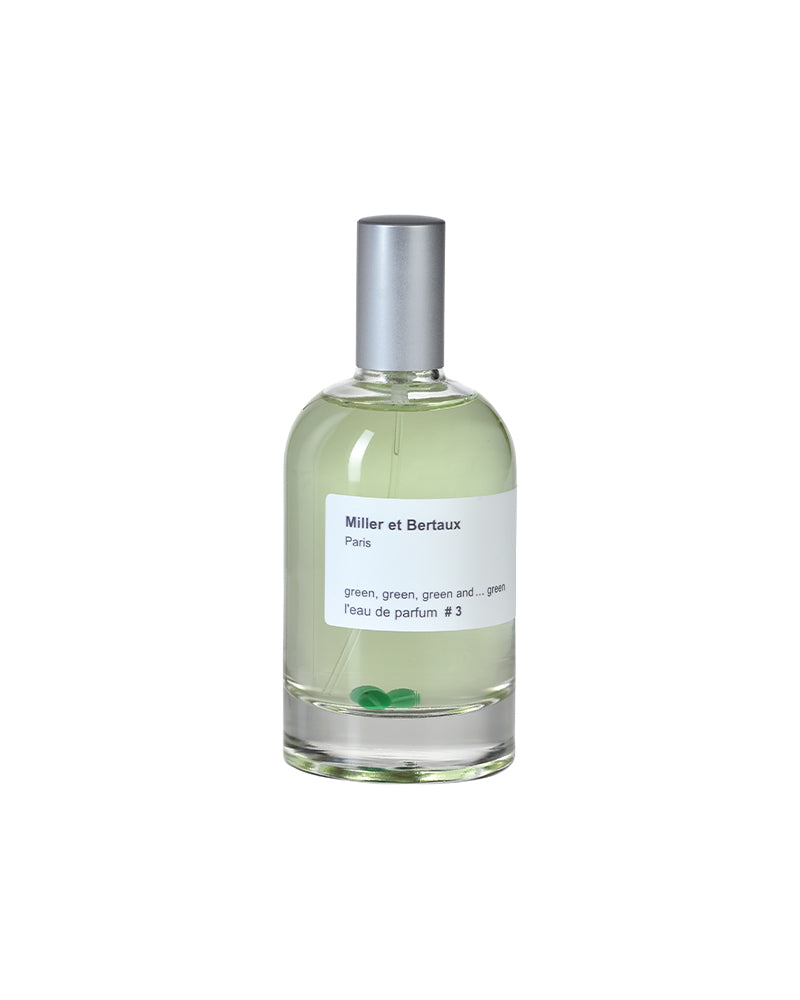 Profumarsi con un colore! Impossibile? Nulla è impossibile nell’universo di Miller et Bertaux. Il suo nome sembra un mantra invocante il potere rigenerante del verde. La sua piramide olfattiva traduce in odore una palette di sfumature cromatiche che vanno dal verde più tenero a quello più intenso. Un gioco di parole e note: verde, verdino, verdone, verdognolo, verde smeraldo, verde acido, verde pastello, verde acqua…È una fantasia vegetale poetica e serena. È l’energia rivitalizzante della natura. Indossarla è come stendersi su un prato verde di primavera e sentire l’odore dell’erba che solletica nel naso.