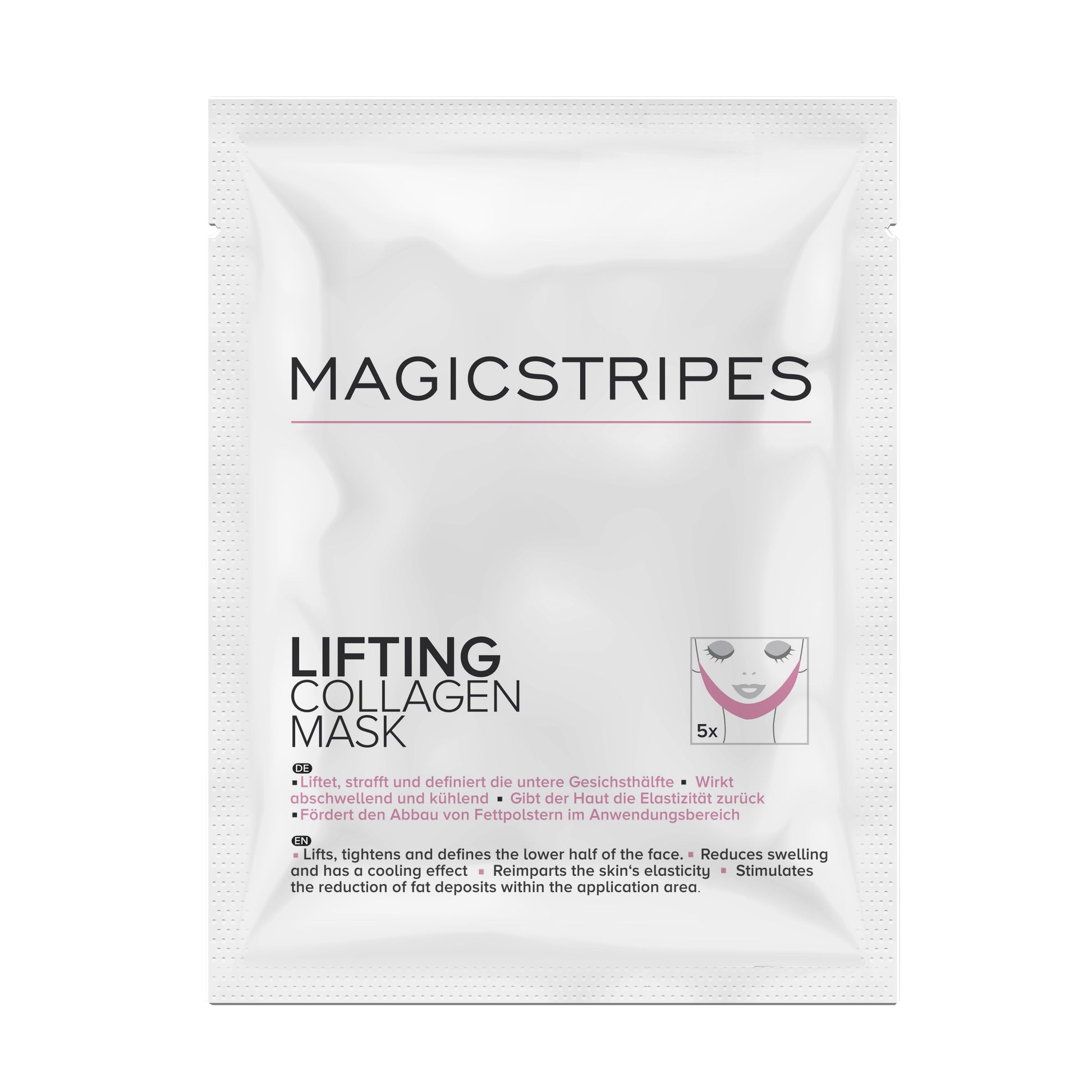 Una maschera facciale unica, per definire e levigare i contorni della metà inferiore del viso. L’innovativa Lifting Collagen Mask contiene una selezione di potenti ingredienti attivi, i quali, combinandosi alla particolare struttura della maschera, fanno sì che il viso ritrovi la sua naturale forma a “V”. Allevia i sintomi di gonfiore, è efficace contro la comparsa del doppio mento e risolleva la pelle rilassata nella zona del mento, mandibole e guance laterali. Ridefinisce i contorni della parte inferiore del viso sia frontalmente che lateralmente, per un effetto lifting rassodante. Nutre e idrata. Rassoda e contrasta il rilassamento cutaneo. Migliora l’elasticità della pelle. La particolare combinazione di elementi amplifica i principi attivi, rimodellando visibilmente i contorni facciali. La Lifting Collagen Mask contiene collagene, caffeina, vitamina C, vitamina E, olio di noce di macadamia e acqua.